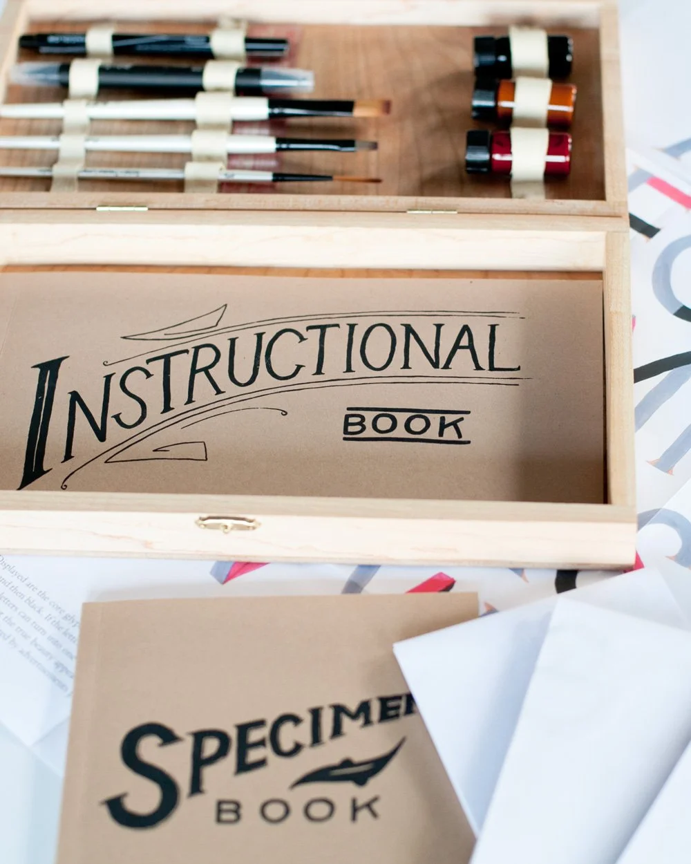 Instead of physical letterforms, the typeface lives as a toolkit. The custom box contains teaching materials alongside fold-out type specimen posters, visual references that inspired the font, and a curated set of tools—including brushes, pens, inks, and a ruler—encouraging users to actively participate in recreating the letterforms by hand.